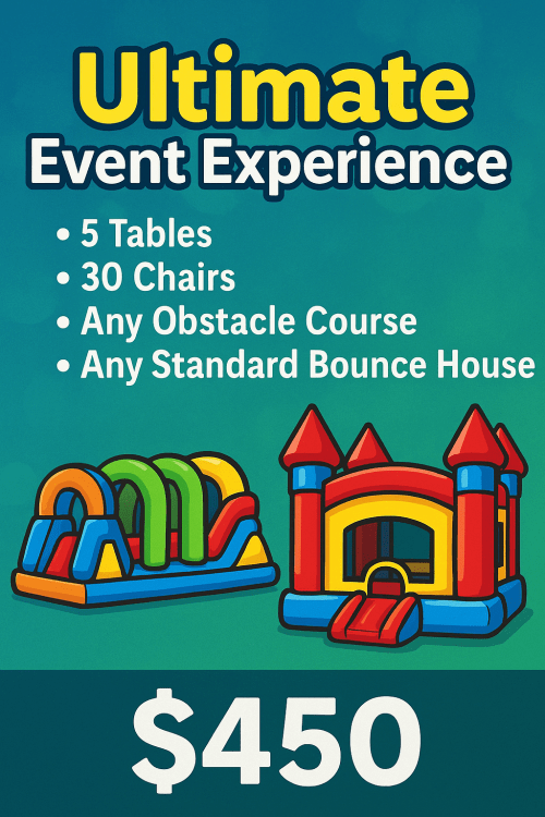 Go BIG with the Ultimate Event Experience! πŸŽ‰ Perfect for schools, churches, large family parties, community events, and festivals — this bundle delivers major entertainment AND plenty of seating. With a huge obstacle course AND a standard bounce house, you get two inflatables that keep guests moving all day long! πŸ’₯