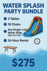 Beat the heat with our refreshing Water Splash Party Bundle! πŸŒŠβ˜€οΈ This package is ideal for summer parties, backyard celebrations, and family gatherings that need cool, splashy fun. Your guests will enjoy tables, seating, and an exciting single-lane water slide (up to 16 ft!) that keeps the fun going all day.